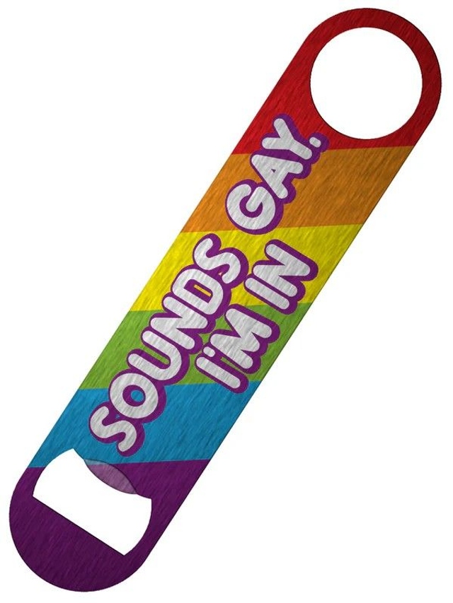 This pride themed beer bottle opener features the phrase 'Sounds Gay, I'm In' set onto a vibrant rainbow background.